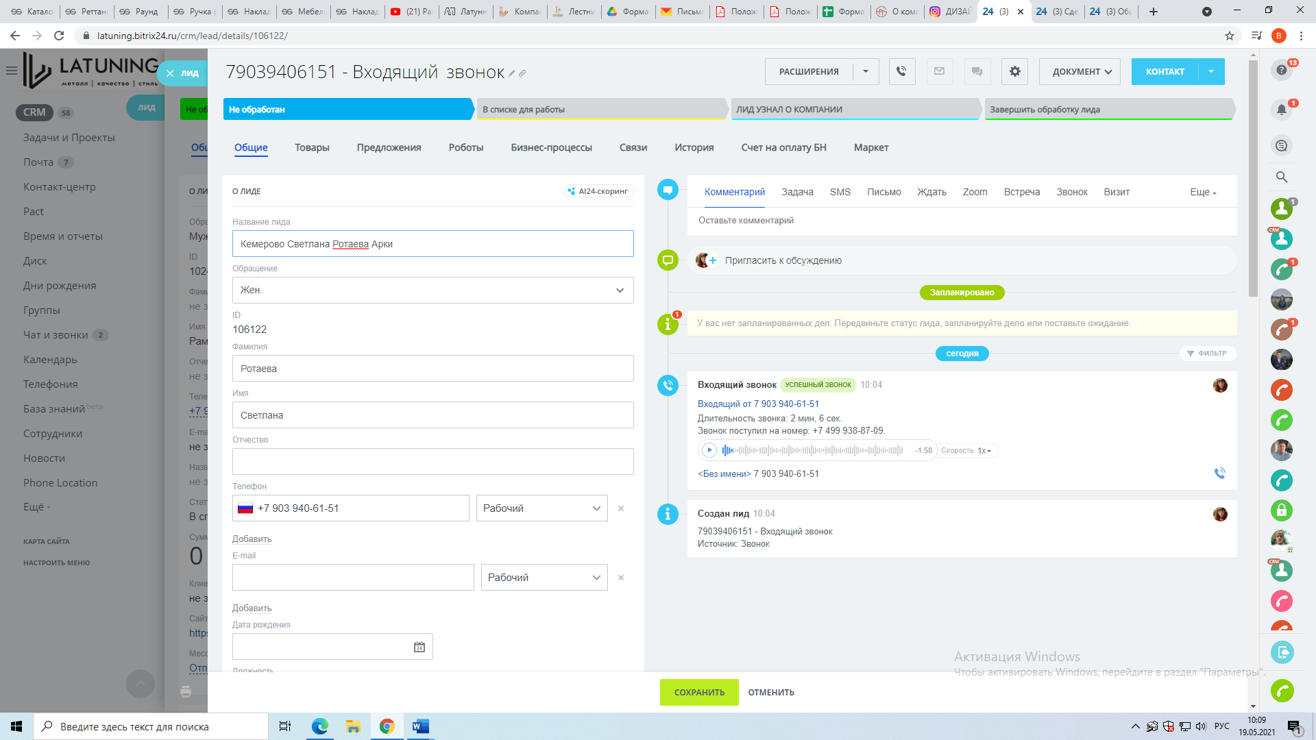 Название лида: город, имя (имя и фамилия), продукт. Внеси имя клиента, а также другую информацию, которую узнал(а) во время звонка. Если фамилию не удалось установить, то можно указать продукт или род занятий контакта. Но на этапе выставления счета необходимо будет внести настоящую фамилию клиента.
