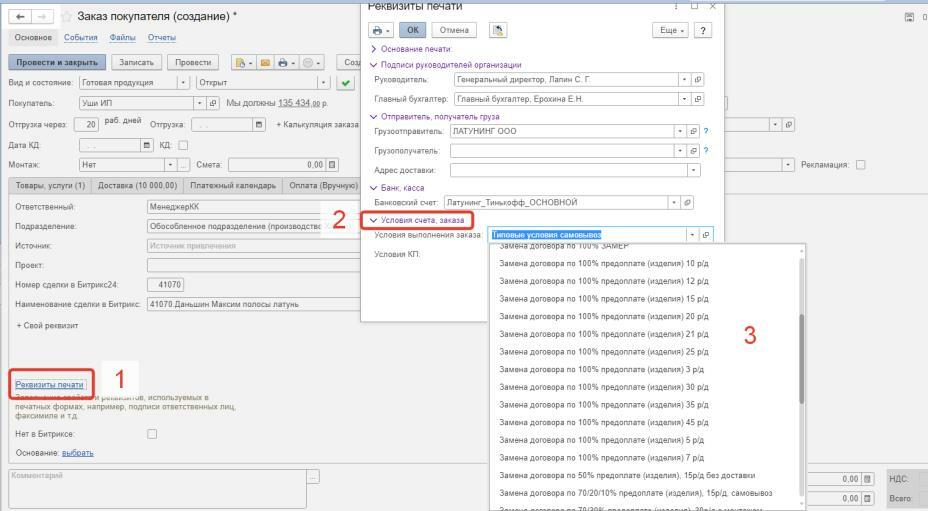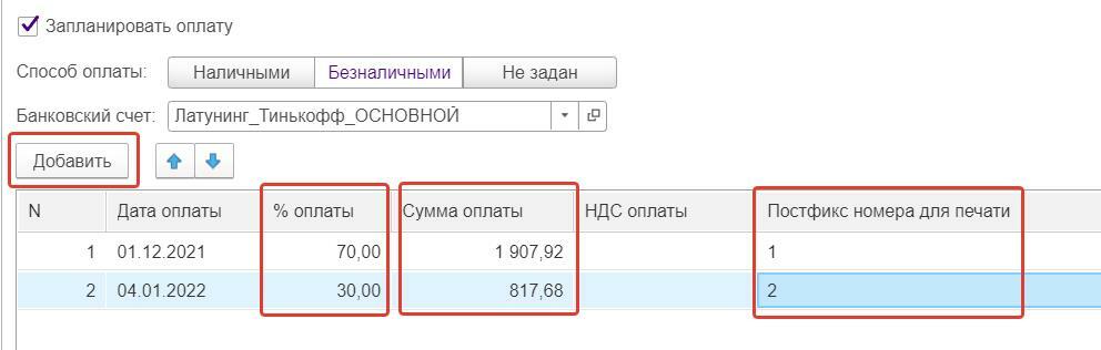 С помощью кнопки "Добавить" внеси необходимое количество этапов оплаты. Можно заполнить поле "% оплаты", при этом поле "Сумма оплаты" пересчитается автоматически. Либо наоборот, проставить ту сумму, которую готов оплатить клиент и поле "% оплаты" так же пересчитается автоматически. Постфикс номера для печати появится в печатной форме счета.