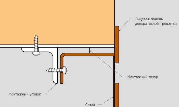 Декоративная вентиляционная решетка изготавливается из резной панели с рамкой, к которой жестко приварена отбортовка с проушинами для скрытого крепежа. К боковой стенке вентиляционного адаптера или отверстия монтируется стальной уголок с несколькими отверстиями. Через рисунок орнамента, решетка жестко фиксируется к уголку. Такой скрытое крепление исключает наличие саморезов на лицевой стороне решетки. Для уменьшения зрительной проницаемости, отверстие выкрашивается в черный цвет или к вентиляционной решетке крепится перфорированная сетка с внутренней стороны. Такое крепление выдерживает очень большой вес и позволяет монтировать решетки любого типа и на любые отверстия на поверхностях.